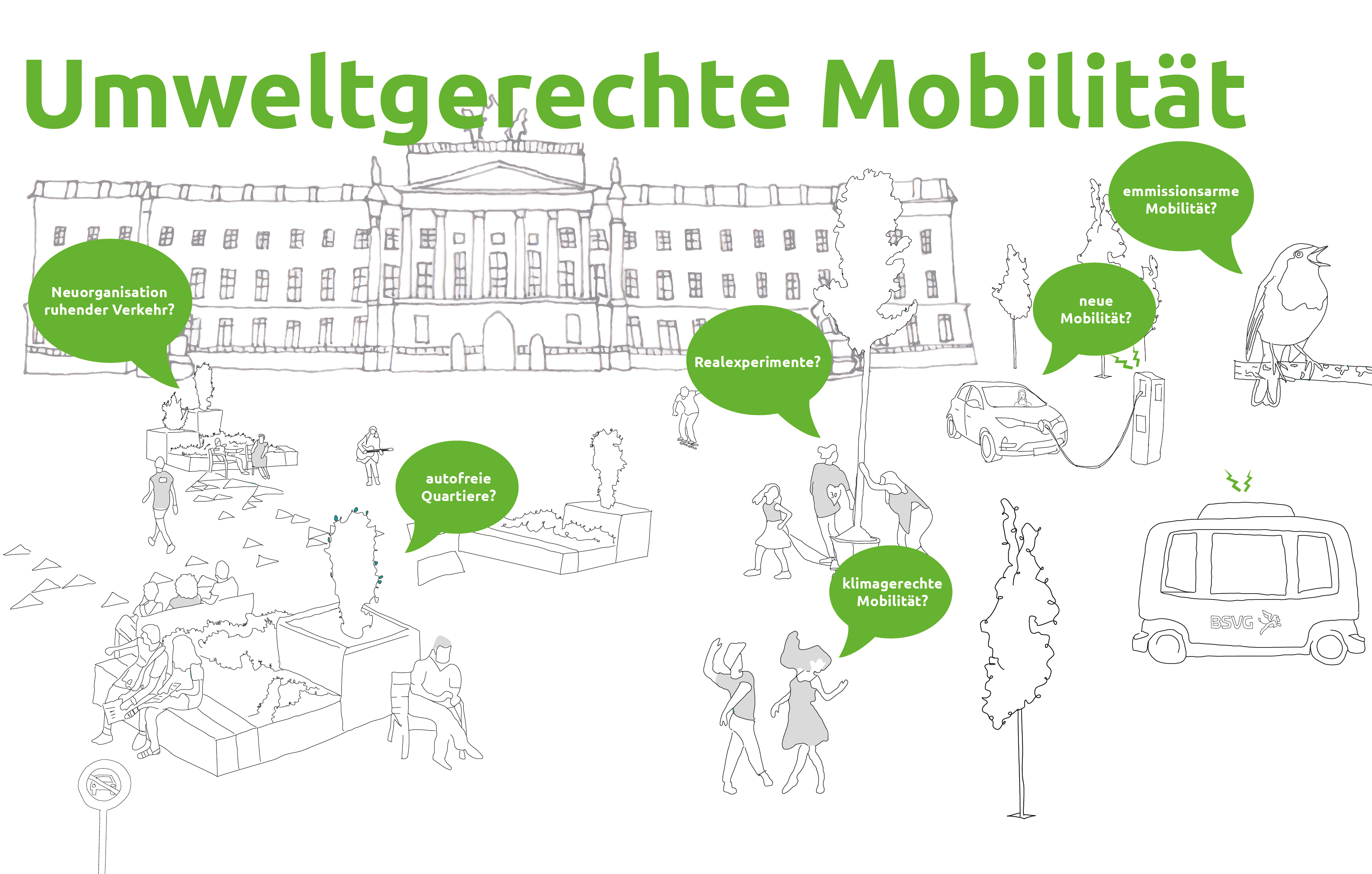 Braunschweig ist im Jahre 2035+ zu einer Stadt geworden, in der Mobilitätsräume auch bunte und grüne Aufenthaltsräume sind. Es sind Räume der Vielfalt, des Zusammenkommens, der Erholung und zugleich der Fortbewegung und Dynamik. Klimaneutralität hat in der Verkehrsplanung und im Mobilitätsverhalten eine bedeutende Rolle eingenommen.