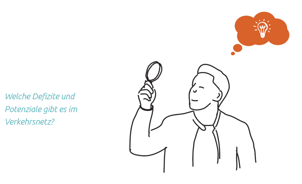 In der ersten Phase des Prozesses werden bestehende Verkehrsdaten, Analysen und Konzepte von den Planenenden (Planersocietät und WVI) zusammengetragen und analysiert. Ebenso werden Verbindungen zu bestehenden Mobilitätsprozessen und themenübergreifenden Planwerken – wie beispielsweise dem Stadtbahnausbaukonzept oder dem Integrierten Klimaschutzkonzept – hergestellt. Potenziale und Defizite sind das Ergebnis dieser ersten Analyse-Phase.